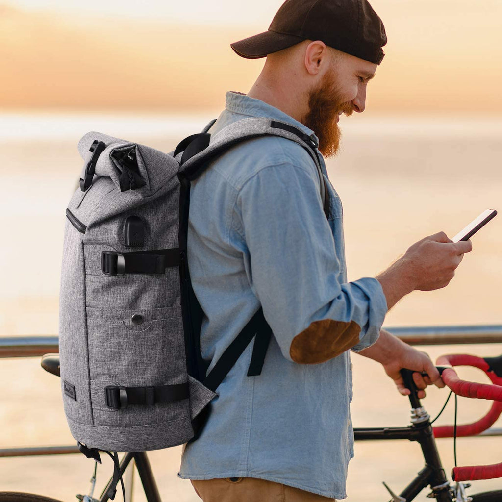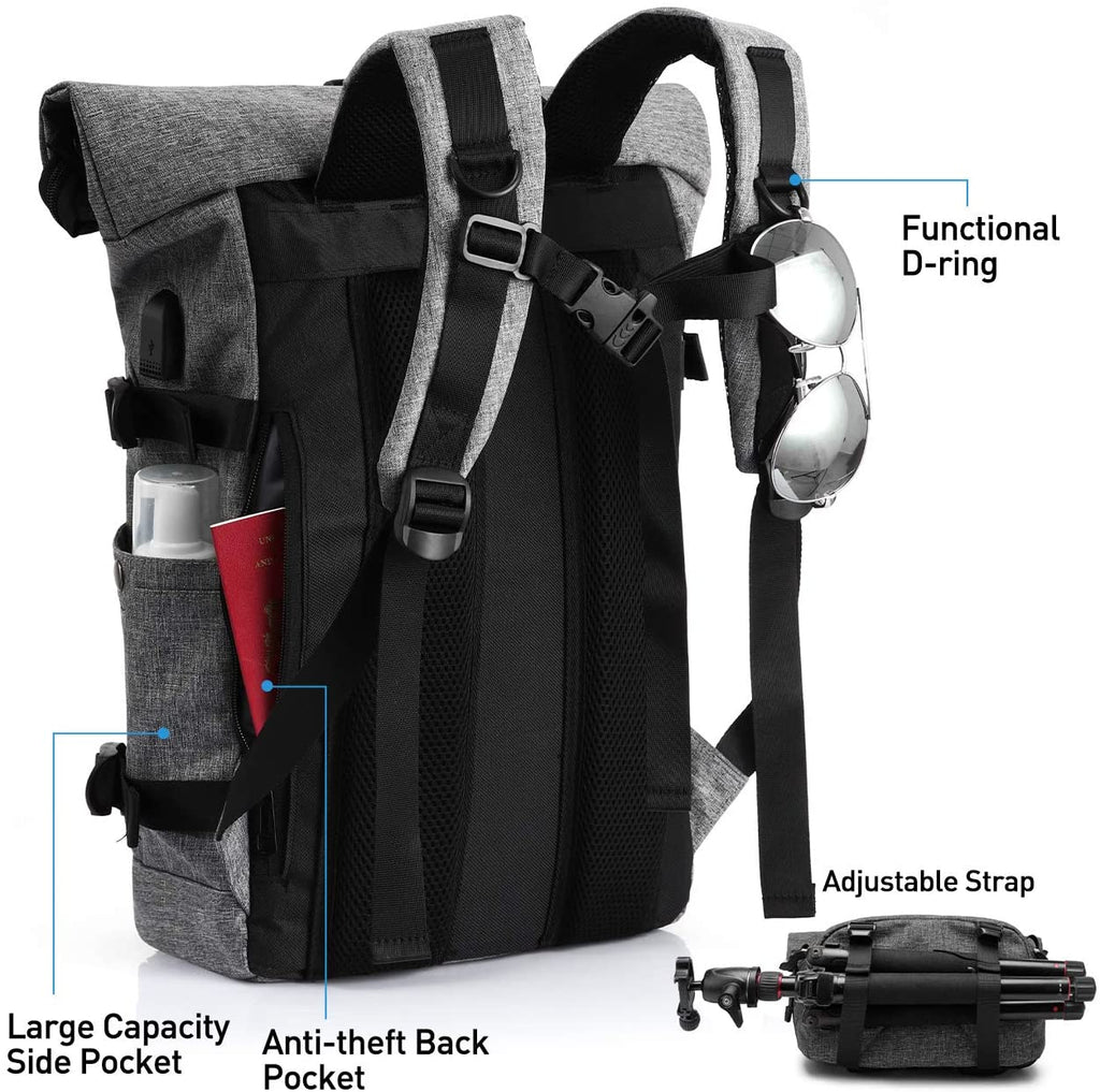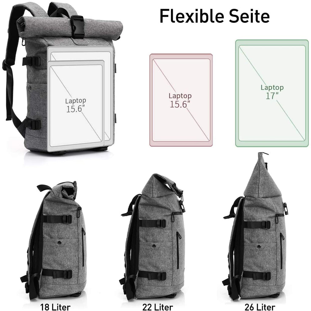 • 【Anti-Diebstahl-Rucksack】 Rolltop rucksack. Volle Reißverschlüsse plus Schließen zum Aufrollen und Anschnallen. Es verfügt über ein 17-Zoll-Laptopfach mit Riemenschutz, ein geräumiges Hauptfach, 2 Fronttaschen, 2 Seitentaschen, eine Diebstahlsicherungstasche auf der Rückseite und mehrere Multifunktionstaschen