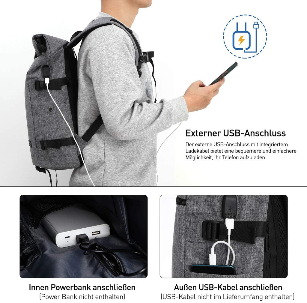 Laptop Rucksack Herren,Rolltop Rucksack Schulrucksack Jungen Teenager mit USB Ladeanschluss & 17 Zoll Laptopfach für Schule,freizeit,Arbeit,für Männer Damen